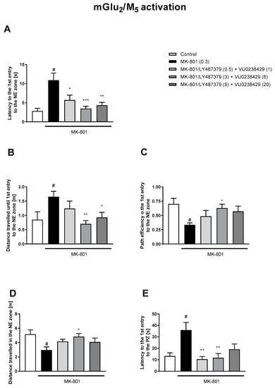 The effects of concomitant administration of LY487379 and VU0238429 on MK-801-induced deficits in the retention of spatial memory in the MWM in CD1 mice. Sub-titles represent latency to the 1st entry to the NE zone (A), distance travelled until 1st entry to the NE zone (B), path efficiency to the 1st entry to the NE zone (C), distance travelled in the NE zone (D) and latency to the 1st entry to the PZ (E). The values are expressed as the means ± SEMs. # p < 0.001 vs. control group and * p < 0.05, ** p < 0.01, vs. the MK-801-treated animals (N = at least 8–10). PZ—platform zone.