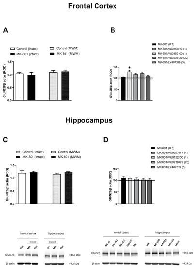 The effect of the Morris Water Maze (MWM) procedure on GluN2B expression in the frontal cortex (A) and hippocampus (C) of the mouse brain, and the effect of the investigated compounds on GluN2B expression in the frontal cortex (B) and hippocampus (D) of MWM-trained mice. ROD, relative optical density. The values are expressed as the means ± SEMs. * p < 0.05 vs. the MK-801-treated animals (N = at least 8–10).