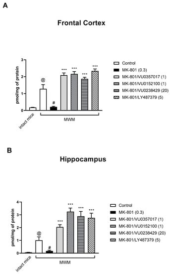 The effect of the Morris Water Maze (MWM) procedure on cGMP synthesis, and the effect of the investigated compounds in the frontal cortex (A) and hippocampus (B) of MWM-trained mice. The values are expressed as the means ± SEMs. @ p < 0.001 vs. intact mice, # p < 0.001 vs. MK-801-treated animals, and *** p < 0.0001 vs. the MK-801-treated animals (N = at least 8–10).