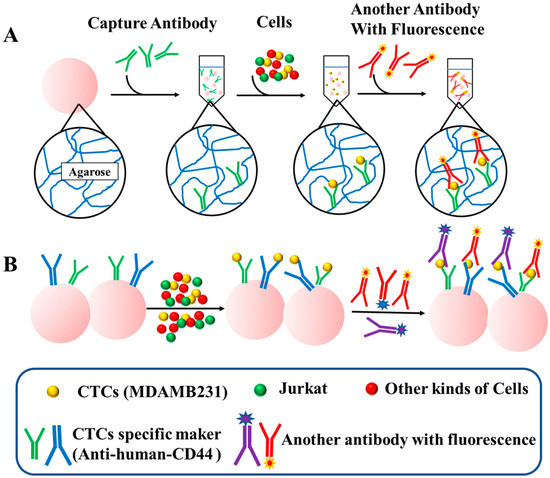 Overall workflow of chemically-modified Sepharose 6B beads for detecting CTCs. (A) Schematic diagram of the structure of the Sepharose 6B and the procedure of single marker detection. The Sepharose 6B beads are composed of agarose. The probe antibodies are immobilized on the Sepharose 6B by thiol groups of agaroses. (B) The procedure of multiplex detection based on the different kinds of antibodies.