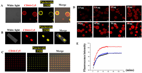 Sepharose 6B beads connected with antibodies. (A) The 2D images of Sepharose 6B beads coupled to CD44-Cy5 antibody and Pan-keratin-TMR, scale bar: 20 μm. (B) The 3D pictures of Sepharose 6B beads coupled to CD44-Cy5 antibody and Pan-keratin-TMR. (C) The 2D series pictures of Sepharose 6B beads coupled to CD44-Cy5 antibody and Pan-keratin-TMR. (D) Different amounts of CD44-Cy5 antibody connected to 2 mg Sepharose 6B beads. The appropriate amount of antibody is 30 μg, scale bar: 50 μm. (E) The kinetic study of fluorescence intensity changes with beads’ reactions over time. The blue, red and black lines represent three separate experiments of the kinetic study.