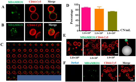 CD44-antibody-modified Sepharose 6B beads detected MDAMB231 cells. (A) The 2D images of CD44-antibody-modified Sepharose 6B beads after binding to MDAMB231 cells (green). Scale bar: 50 μm. (B) The 3D images of CD44-antibody-modified Sepharose 6B beads after binding to MDAMB231 cells (green). (C) The 2D series images of CD44-antibody-modified Sepharose 6B beads coupled to CD44 antibody after incubation with MDAMB231 cells. (D) The efficiency of CD44-antibody-modified Sepharose 6B beads in capturing MDAMB231 cells. Cell density of 10,000 cells/mL, 1000 cells/mL, 100 cells/mL. (E) The pictures of the cell capture efficiency of CD44-antibody-modified Sepharose 6B beads incubated with different concentration of MDAMB231 cells, scale bar: 100 μm. (F) The pictures of CD44-antibody-modified Sepharose 6B beads after incubation of MDAMB231 cells and Jurkat cells, scale bar: 100 μm.
