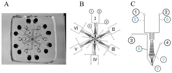 Schematic diagram of microfluidic chip structure. (A) Physical diagram of microfluidic chip. (B) Schematic diagram of 6-channel chip. The numbers I- VI represent that this chip is a six-channel chip. Among them, I, II and III channels were the control group, and IV, V and VI channels were the 30 s experimental group. (C) Single-channel loading unit. ① Chemokine injection port. ② Cell culture solution injection port. ③ Waste liquid outlet. ④ Cell injection port. ⑤ Chemokine transport channel. ⑥ Cell culture medium delivery channel. ⑦ Cell transmission channel. ⑧ Waste liquid channel. ⑨ Cell isolation zone.