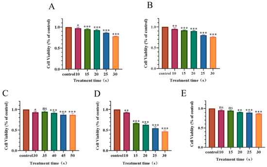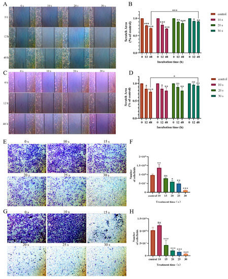 According to previous studies, when the cell viability was less than 75%, the unavoidable reduction in cell viability induced by PAM will decrease the cell migration and invasion ability [43]. To avoid this problem, the LTP exposure time in this experiment was selected to be 30 s or less. In addition, according to the results, for the subsequent experiments we selected H460 and PC-9 lung cancer cells to conduct, and determined that the time for cell treatment with LTP in the subsequent experiments was 0 s, 10 s, 15 s, 20 s, 25 s, and 30 s.