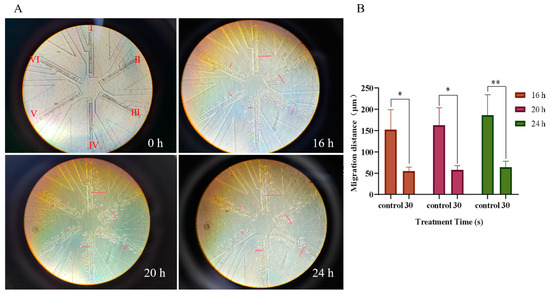 Observation of the effects of PAM treatment on PC-9 cell migration using high throughput microarray. (A) The migration of PC-9 cells on the chip was recorded at regular intervals, and the migration locations of cells on the chip at 0 h, 16 h, 20 h, and 24 h were recorded. The Ⅰ, Ⅱ, and Ⅲ channels were used as the control group, and the Ⅳ, Ⅴ, and Ⅵ channels were used as the LTP (30 s) treatment group. The auxiliary red line in the figure represents the straight-line distance of PC-9 cell migration. (B) Quantification of the migration distance of PC-9 cells incubated at different times after 30 s PAM treatment. Data represent the mean ± SD of three independent experiments. * p < 0.05, ** p < 0.01 with ANOVA compared with the control.