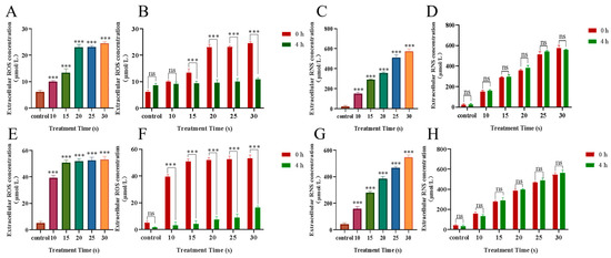 PAM was obtained from the cell culture medium after LTP treatment, and the active substance content was immediately detected. The results are shown in Figure 5; extracellular ROS and RNS increased in a dose-dependent manner with the prolongation of treatment time. After 4 h of incubation, the extracellular ROS decreased significantly, but the extracellular RNS did not significantly change. In addition, the brightness of the green fluorescence representing intracellular ROS content also increased in a dose-dependent manner with treatment time 4 h after LTP treatment (Figure 6). The results showed that, after LTP treatment, intracellular ROS and extracellular RONS increased in a dose-dependent manner. Moreover, the decreased extracellular ROS content and increased intracellular ROS content at 4 h after LTP treatment further indicated that high-dose ROS produced by LTP might enter NSCLC cells as messengers and change the biological activities of cells to a certain extent, for example, inhibiting the migration of NSCLC cells.
