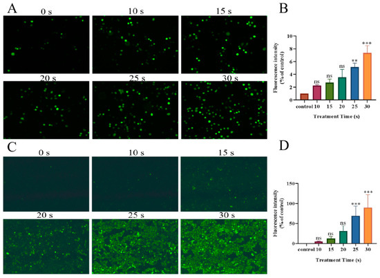 After PAM treatment, green fluorescence represents the level of ROS in H460 cells and PC-9 cells. (A) Fluorescence image of ROS level in H460 cells after PAM treatment. (B) H460 cells’ intracellular fluorescence level quantification. (C) Fluorescence image of ROS level in PC-9 cells after PAM treatment. (D) PC-9 cells’ intracellular fluorescence level quantification. In (B,D), brown bars, red bars, yellow-green bars, green bars, blue bars and yellow bars represent the control group, 10 s PAM treatment group, 15 s PAM treatment group, 20 s PAM treatment group, 25 s PAM treatment group and 30 s PAM treatment group. Data represent the mean ± SD of three independent experiments. “ns” means no statistical difference. ** p < 0.01,*** p < 0.001 with ANOVA compared with the control.