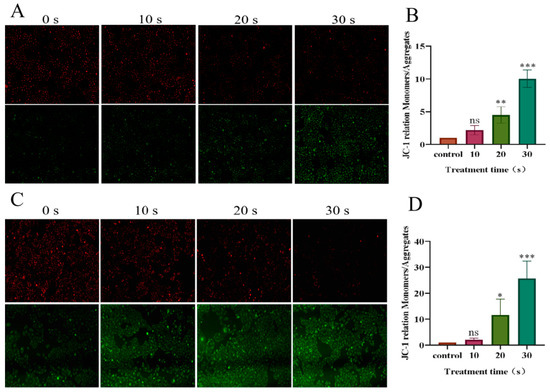Fluorescence microscopy was used to observe the experimental results. As shown in Figure 8, the green/red fluorescence ratio increased in a dose-dependent manner with the prolongation of LTP treatment time. Compared with the control group, the green/red ratio of H460 cells in the long-term PAM treatment group was 10.04 times that of the control group. The green/red ratio in the PC-9 cell long-term PAM treatment group was 25.76 times that of the control group. The results showed that mitochondrial membrane potential in NSCLC cells decreased in a dose-dependent manner with the prolongation of LTP treatment. Long-term LTP treatment significantly reduced the mitochondrial membrane potential of cancer cells and induced early apoptosis.