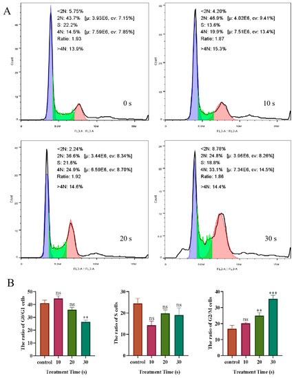 The effect of LTP treatment on the PC-9 cell cycle. (A) Flow cytometry was used to analyze the cycle distribution of LTP-treated PC-9 cells. Among them, the purple region represents G0/G1 phase, the green region represents S phase and the red region represents G2/M phase. (B) Quantitation of the percentage of cells in the G0/G1, S, and G2/M periods after LTP treatment. Data represent the mean ± SD of three independent experiments. “ns” means no statistical difference. ** p < 0.01, *** p < 0.001 with ANOVA compared with the control.