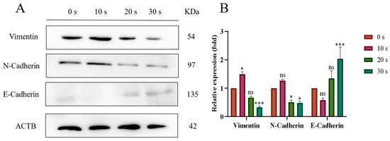 The EMT process was closely related to cell migration. Western blot was used to detect the expression levels of EMT-process-related proteins in NSCLC cells after LTP treatment. The results are shown in Figure 10. In the 10 s PAM treatment group, the expressions of N-Cadherin and Vimentin increased, while the expression of E-Cadherin decreased. However, with the further prolongation of PAM treatment, the expression levels of N-Cadherin and Vimentin decreased in a dose-dependent manner (20 s and 30 s), and the expression level of E-Cadherin increased in a dose-dependent manner. The evidence suggested that prolonged LTP treatment could inhibit the migration of NSCLC cells by inhibiting the EMT process.