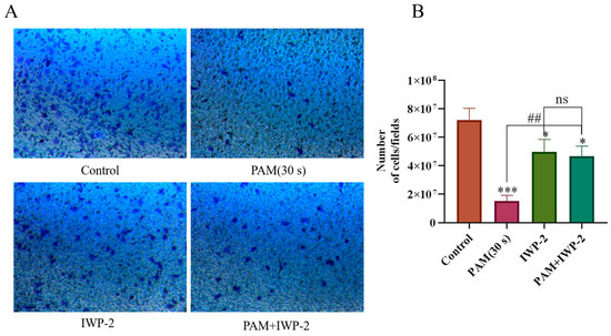 PAM treatment inhibited PC-9 cell migration through the Wnt/β-catenin signaling pathway. (A) Transwell migrated images from the control group, the PAM (30 s) treatment group, the IWP-2 alone treatment group, and the IWP-2 pretreatment group. (B) Quantitative analysis of cell migration. Data represent the mean ± SD of three independent experiments. “ns” means no statistical difference. * p < 0.05, *** p < 0.001 with ANOVA compared with the control. ## p < 0.01.