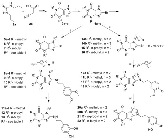 The synthetic strategy to obtain xanthine derivatives fused with a dopamine fragment included: first, the preparation of the xanthine part of the molecules, and then, the conjugation with a dopamine moiety whose hydroxy functions were protected by methyl groups (Scheme 1).