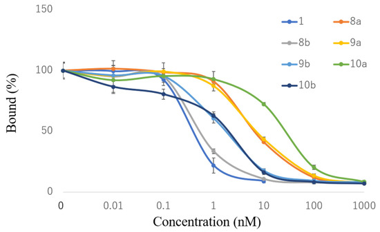 Binding of the vitamin D analogs ADKM1-6 (8a, 8b, 9a, 9b, 10a and 10b) and 1,25(OH)2D3 (1) to hVDR-LBD. Human VDR−LBD, expressed as glutathione S-transferase fusion protein, was incubated with [3H]-1,25(OH)2D3 in the presence of nonradioactive vitamin D (1, light blue), 8a (orange), 8b (gray), 9a (yellow), 9b (blue), 10a (green), and 10b (dark blue) over a range of concentrations. All values represent the means, and error bars are the standard deviations derived from triplicate assays.