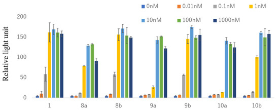 Transcriptional activity of vitamin D analogs ADKM1-6 (8a, 8b, 9a, 9b, 10a and 10b) compared with 1,25(OH)2D3 (1) in HEK293 cells. HEK293 cells were co-transfected with TK-Spp × 3-LUC reporter plasmid and pCMX−VDR, and 8 h after transfection the cells were treated with several concentrations of each compound. After 24 h, the cells were harvested for assaying luciferase and β-galactosidase activity using a luminometer (Molecular Devices, Sunnyvale, CA, USA).