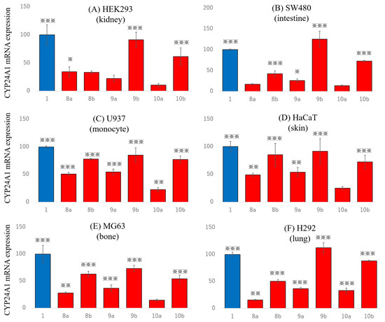 Effects of vitamin D analogs on the gene expression in different cell types: Effects on the expression of CYP24A1 in kidney-derived HEK293 (A), intestine-derived SW480 (B), monocyte-derived U937 (C), keratinocyte-derived HaCaT (D), bone-derived MG63 (E), and lung mucoepidermoid carcinoma-derived H292 (F) cells. Cells were treated with ADKM1-6 (8a, 8b, 9a, 9b, 10a and 10b) or 1,25(OH)2D3 (1) (100 nM) for 24 h, and the expression of CYP24A1 was determined via reverse transcription and quantitative real-time PCR analysis. One-way ANOVA followed by Turkey’s multiple comparisons: ※ p < 0.05, ※※ p < 0.01, ※※※ p < 0.001 versus vehicle control.