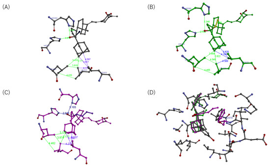 Since we do not have crystal structures of ADKM1-6 (8a, 8b, 9a, 9b, 10a and 10b)/VDR complexes, we constructed the three-dimensional structures of those rVDR complexes via a computational method using the X-ray crystal structure data (3vtb) of ADTK1 (5b) [42] as a model (see the Materials and Methods section). The calculated model structures of the three compounds ADKM2, ADKM4, and ADKM6 (8b, 9b, and 10b, respectively) complexed with rat VDR are shown in Figure 6. In all of the computational structures, the two His residues 301 and 393 are placed within hydrogen-bonding distance with respect to the 25-hydroxy group. The three Leu residues (Leu223, Leu400, and Leu410) and the adamantane ring of the ligand are situated in the agonistic positions, interacting with one another similarly to the rVDR/1,25(OH)2D3 (1) complex (Figure 7A). The 25-methyl and ethyl groups were inserted into a pocket of the VDR where they did not interfere with nearby residues. Only the n-butyl group of ADKM6 (10b) interfered with Phe418, which then would change the conformation to adopt the n-butyl group in the pocket, as shown in Figure 6D. The introduction of methyl, ethyl, and n-butyl groups at C-25 increases the hydrophobic interaction energy (FMO, inter-fragment interaction energies (IFIEs)) of Phe418 in ADTK2 (8b), ADKM4 (9b), and ADKM6 (10b) to −6.34, −7.40, and −10.95 kcal/mol, respectively, when given −3.64 kcal/mol of ADTK1 (5b) via the FMO IFIE calculation (Supplementary Materials). ADKM6 (10b) showed the highest activity in an assay to examine the effects of the ligands on the VDR to bind to RXR. The 25S-ethyl substitution had the highest effect on the CYP24A1 induction in kidney (HEK293), intestine (SW480), and lung (H292) cell lines.