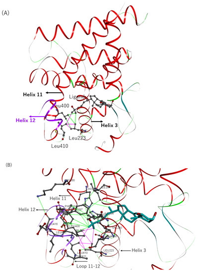 When a ligand binds with a VDR (rat), Leu400 at the N-terminal part of helix 11 and Leu410 at loops 11–12 link to the C-26 of the ligand; then, loops 11–12 bend, and both Leu residues bind to Leu227 at the N-terminal of helix 3, thereby closing up the VDR to form the active conformation (Figure 7A).