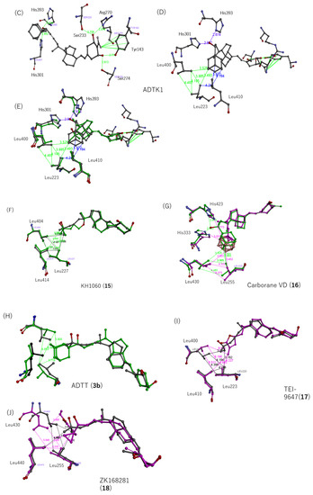 The 23,23,24,24-tetradehydro-VD analog ADTK1 (5b) showed partial agonistic activity, in contrast to the 22,23-didehydro analog ADTT (3b) (Table 1), which had antagonistic properties. ADTK1 (5b)/rVDR is shown in Figure 7D at the position of the three Leu’s. Here, Leu223 and Leu400 strongly interact at their Cδ, with Å distances of 3.985, 4.481, and 4.195; in addition, Leu223, Leu400, and a secondary AD carbon of the ligand interact at Å distances of 3.985, 3.525, and 3.493, respectively, forming a rigid triangular relationship. Figure 7F shows the hVDR complex of the superagonist 1,25-dihydroxy-20-epi-22-oxa-24,26,27-trihomo vitamin D analog KH1060 (15), overlaid with 1,25(OH)2D3 (1)/hVDR. The two VDR complexes are well overlapped, regardless of the bulky side chain of 15. This shows that the bulky-but-flexible side chain can be sufficiently placed within the VDR pocket. Carboranyl VD (16) is a superagonistic analog with a carborane cluster at C-24 in the place of the adamantane ring of the ADVD compounds [55]. Carborane (C2B10H12) is a boron cluster molecule, and in the 24-carboranyl VD/zVDR complex it interacts with two His residues, His301 and His393, instead of the 25-hydroxyl group of the natural ligand. The VDR complexes of carboranyl VD(15)and ADTK1 (5b) are well overlapped, as shown in Figure 7G. The VDR affinity and transcriptional activity of carboranyl VD (15) are reported to be similar to those of 1,25(OH)2D3 (1), but its calcemic effect is smaller than that of 1,25(OH)2D3 (1) [48].