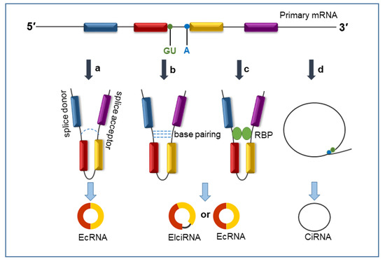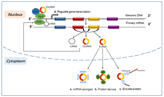 - Li, Z.; Huang, C.; Bao, C.; Chen, L.; Lin, M.; Wang, X.; Zhong, G.; Yu, B.; Hu, W.; Dai, L.; et al. Exon-intron circular RNAs regulate transcription in the nucleus. Nat. Struct. Mol. Biol. 2015, 22, 256–264. [Google Scholar] [CrossRef]