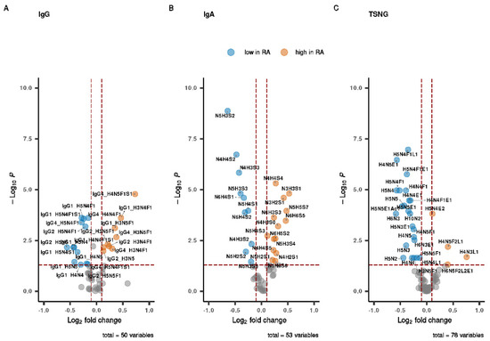 Volcano plots of differences in glycosylation between RA patients and controls. For the three selected data modalities (A) IgG N-glycans, (B) IgA O-glycans and (C) TSNG of RA patients and controls at postpartum timepoint, a comparison was made of relative abundances of each glycosylation trait using a nonparametric univariate test, the p-values were corrected for multiple testing. All significantly different structures are colored. All IgG subclasses showed differences in Fc glycosylation profiles between RA and controls. Consistent with the literature, non-galactosylated glycoforms were lower in RA. Interestingly, a number of monogalactosylated glycoforms such as IgG1_H4N4F1 and IgG4_H4N5F1S1 were found to be lower in RA. All measured values are summarized per the dataset in Supplementary Table S1.