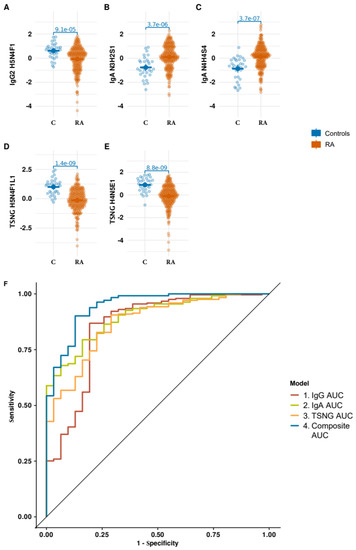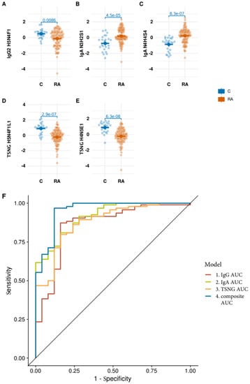 The complex signature presented on the Supplementary Figure S2 gives an overview of the glyco-traits associated with RA, but using such a complex combination of the measured glyco-traits for a prediction, etc., would be unpractical. Therefore, as a next step, we decided to adopt the signature for a logistic regression. For the given data, the most important part of the procedure was to remove the possible multicollinearity effects which could inflate the resulting logistic regression models and result in overoptimistic performance metrics. Figure 2A–E shows the “beeswarm” plots for the optimized selection of glyco-traits consisting of five structures: one from the IgG Fc N-glycans data set (IgG2/3-H5N4F1), two from TSNG (H5N4F1L1 and H4N5E1) and two from IgA O-glycans (N3H2S1 and N4H4S4). Furthermore we compared the composite/integrative model with the models built for each individual data set. A model optimization was performed to find an optimal predictor combination for IgG Fc N-glycans, IgA and TSNG separately. Figure 2F shows the receiver operating characteristic (ROC) plots for all the models. The area-under-the-curve (AUC) of the composite model was found to be 0.945. The IgA O-glycans data set showed the highest AUC (0.896) among the models built on the individual data sets, with TSNG and IgG showing values of 0.871 and 0.852, respectively. Supplementary Table S2 summarizes all the essential metrics (odds ratios, standardized β coefficients) for the integrative and individual models.
