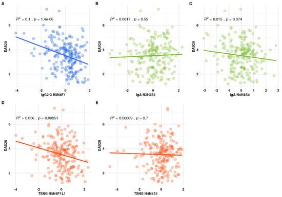 Linear associations between DAS28 and the predictors (glyco-traits) of the composite model. A linear model with DAS28 as a response variable was built for each of the selected glyco-traits. Only two features show a significant association with DAS28, being IgG2 H5N4F1 (p = 1.39 × 10−6) and H5N4F1L1 (p = 0.0005). The variance explained by the model was only 10% for IgG2 H5N4F1 and 5% for TSNG H5N4F1L1.