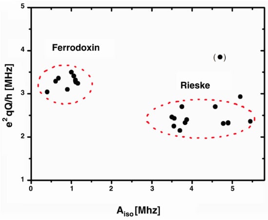 Plot of the hyperfine (Aiso) and quadrupole (e2qQ/h) couplings of different iron sulphur clusters in different species [17].