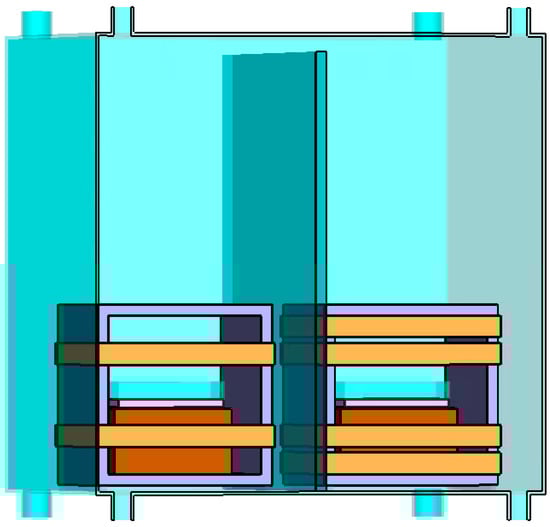 Experimental setup showing the configuration of two Helmholtz coils inside a mu-metal cage. The left coil consists of a single pair of turns and generates SMF for control cells. The right coil comprises two pairs of turns, the inner coil generates SMF, and the outer coil generates RF magnetic field for treated cells. A mu-metal sheet separates the two coils within the cage.