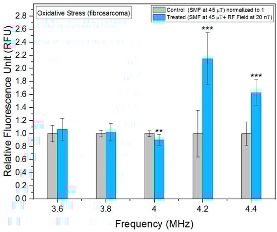 Oxidative stress as a function of frequency in fibrosarcoma cells. The data are expressed as mean ± SD; (n = 24, N = 2) for each group, and p-values are presented in Table A1 in Appendix A. ** p < 0.01, and *** p < 0.001 represent significant differences.