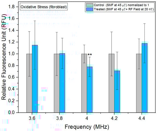 Oxidative stress as a function of frequency in fibroblast cells. The data are expressed as mean ± SD; (n = 24, N = 2) for each group, and p-values are presented in Table A2 in Appendix A. ** p < 0.01 represents significant difference.