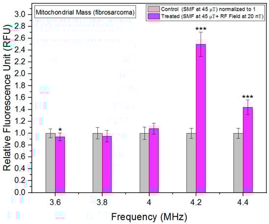 Mitochondrial mass as a function of frequency in fibrosarcoma cells. The data are expressed as mean ± SD; (n = 24, N = 2) for each group and p-values are presented in Table A3 in Appendix A. * p < 0.05, and *** p < 0.001 represent significant differences.