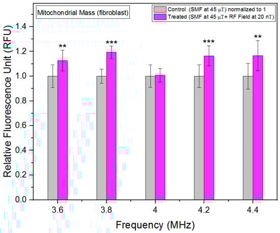Mitochondrial mass as a function of frequency in fibroblast cells. The data are expressed as mean ± SD; (n = 24, N = 2) for each group, and p-values are presented in Table A4 in Appendix A. ** p < 0.01, and *** p < 0.001 represent significant differences.