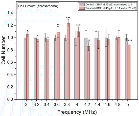 Cell growth rates as a function of frequency in fibrosarcoma cells. The data are expressed as mean ± SD; (n = 16, N = 2) for each group, and p-values are presented in Table A5 in Appendix A. * p < 0.05, ** p < 0.01, and *** p < 0.001 represent significant differences.