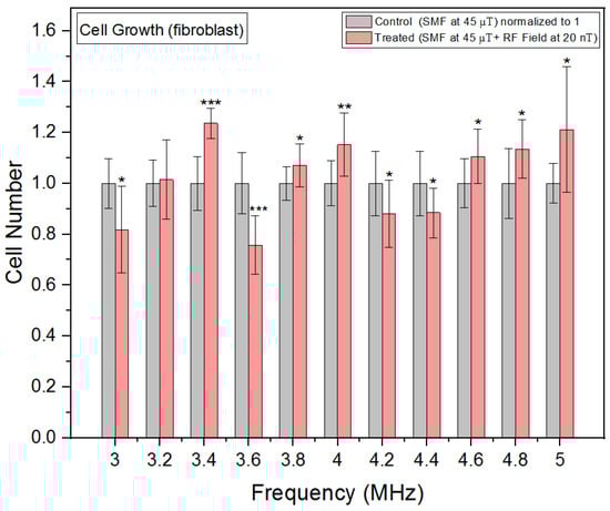 In fibroblast cells, cell growth measurements also demonstrated a non-linear response to the RF exposure frequencies (Figure 9) with significant increases in growth rates at 3.4, 4 and 5 MHz and significant inhibitions at 3 and 3.6 MHz. As opposed to oxidative stress, the fibroblast cell growth exhibits an inverse U-shaped pattern, with higher growth at intermediate frequencies and lower growth at both lower and higher frequencies between 3.6 and 4.4 MHz. This suggests a complex interplay between RF exposure frequencies and cellular responses. While error bars overlapping might be visually misleading, the statistical analysis allowed us to determine whether the observed differences are statistically significant.