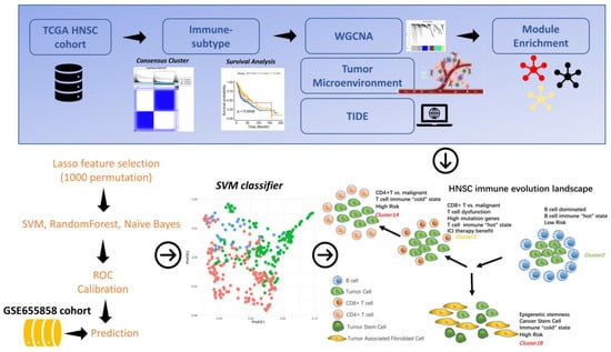 The objective of this study was to examine the immune subtypes of head and neck cancer and to construct molecular evolutionary profiles of these immune subtypes to explore the tumor microenvironmental features and validate their reproducibility in independent cohorts. By performing consistent clustering using immune-related genes, we identified three immune subtypes and five immune-related functional modules. Each immune subtype corresponds to a different clinical, molecular and cellular characteristic. We found that each of the three immune subtypes was associated with different gene expression patterns, molecular and cellular features, and clinical outcomes. Our findings have unveiled the distribution characteristics of the complex tumor microenvironment in HNSC patients and have provided insight into the molecular evolution of tumors. The workflow of this study is shown in Figure 1.