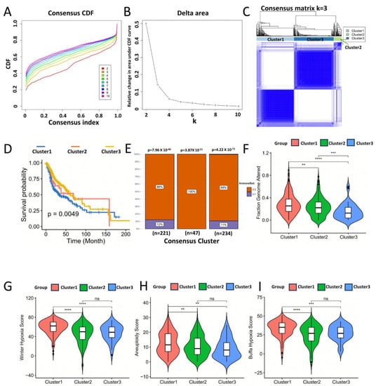 The immune subtype of HNSC can reflect the immune status in the tumor microenvironment, thereby helping to identify suitable patients for immunotherapy. We analysed the expression profiles of 1722 immune-related genes in 502 HNSC samples from the TCGA database for the construction of consistency clusters. Based on their consensus CDF and delta area, we chose k = 3 (Figure 2A,B). Eventually, we obtained three immune subtypes named Cluster1–Cluster3 (Figure 2C). The Kaplan–Meier survival analysis showed that Cluster2 had the best prognosis, Cluster1 the worst, and Cluster3 was in between (hazard ratio: Cluster 2 > Cluster 3 > Cluster 1). There is a significant difference in survival between the three immune subtypes (p = 0.01) (Figure 1D). The immune subtypes of HNSC were evaluated by ImmuneSubtypeClassifier. The results showed that type C2 (IFN-γ dominant) had the highest percentage of the three subtypes (88% in Cluster1, 100% in Cluster2, and 11% in Cluster1). In addition, 12% of Cluster1 belonged to C1 type (wound healing type) and about 11% of Cluster3 belonged to C1 type (Figure 1E). Differences in clinical characteristics between the three immune subtypes were analysed using the cBioPortal database. The results showed that the Fraction Genome Altered, Winter Hypoxia Score, Aneuploidy Score and Buffa Hypoxia Score of Cluster1 were significantly higher than the other two immune subtypes (Figure 2G–I). These results illustrate the significant heterogeneity of the HNSC immune subtypes we obtained by consistent clustering.