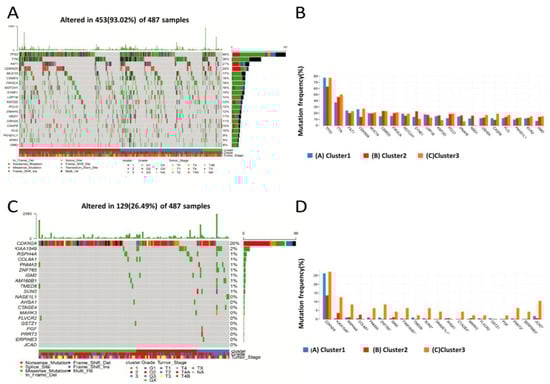 Top 20 significant alteration event frequency genes in different clusters. (A) Frequency distribution of alteration events for the genes with the highest mutation frequencies in different clusters. (B) Mutation landscape of the genes with the highest mutation frequencies. (C) Distribution of mutations in genes with significantly different mutation frequencies among different clusters. (D) Mutation landscape of genes with significantly different mutation frequencies. Wilcoxon test, * p < 0.05.
