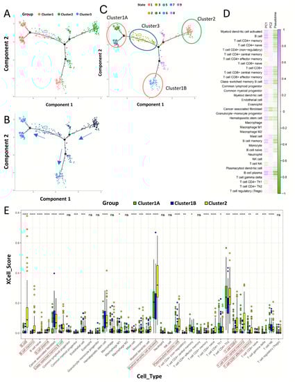 Immune landscape of HNSC. (A) Immune landscape of HNSC. Each dot represents a patient, and the color represents the immune subtype to which it belongs. (B) Immune subtype differentiation trajectory diagram. (C) Nine states of patients obtained using monocle’s DDRTree algorithm. Cluster1 contains three states, state4, state5 and state7; Cluster2 mainly has one state, state1; Cluster3 is mainly distributed in state3. State4 and state5 are considered to be an immune subtype of Cluster1 and named Cluster1A. State7 is considered to be another immune subtype of Cluster1 and is named Cluster1B. The immune subtype of HNSC differentiated from the beginning of state1 to the change process of the terminal expression profile of state4, state5 and state7. (D) Correlation between Comp1, Comp2, Pseudotime and 36 immune cell scores (xCell). (E) Comparison of the mean values of the xCELL scores of 33 immune cells in the 3 immune subtypes. Correlations were performed using the Pearson correlation coefficient, and group comparisons were performed using the Kruskal–Wallis test. * p < 0.01, ** p < 0.001, *** p < 0.0001 and **** p < 0.00001.