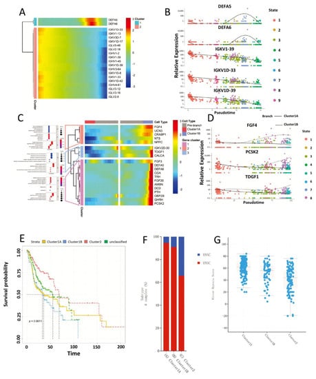 Further immuno-subtyping groupings were made based on samples in the top position in the immunotyping landscape. State1 was named DDRT_Cluster2, State4 and State5 were named Cluster1A, and State7 was named Cluster1B (Figure 5C). Both Component1 and Component2 showed a significant correlation with immune infiltration of multiple immune cells, while Pseudotime had a negative correlation. T cell CD4+ effector memory showed a negative correlation with Component1 and a positive correlation with Component2. Cancer-associated fibroblast and hematopoietic stem cells were positively correlated with Component1 and negatively correlated with Component2 (Figure 5D). Combining the previous findings, we found that Cluster1A is mainly characterized by immune infiltration of CD4+ central memory T cells, NK T cells and Th1 CD4+ T cells (p < 0.01); Cluster1B is mainly characterized by immune infiltration of cancer associated fibroblasts and hematopoietic stem cells in the tumor microenvironment; Cluster3 was mainly characterized by immune infiltration of activated myeloid dendritic cells, B cells, CD8+ T cells, CD8+ central memory T cells, CD8+ effector memory T cells, class-switched B cells, myeloid dendritic cells and plasmacytoid dendritic cells (Figure 5E). Furthermore, in view of the immune evolutionary process simulated by the immune subtypes of HNSC, the immune gene expression profile of HNSC patients changed significantly with the progression of Pseudotime. Among the top 20 most significantly mutated genes, we identified a trend towards obviously lower expression of immunoglobulin-related genes such as IGKV1-39, IGKV1D-33 and IGKV1D-39; while neutrophil-related genes such as DEFA5 and DEFA6 were highly expressed in Cluster1B and lowly expressed in Cluster1A (Figure 6A,B). To further elucidate the differences between Cluster1A and Cluster1B during the molecular evolution of immune subtypes, we analysed branching node 1. The results revealed that the immune genes of Cluster1B are differentially elevated and those of Cluster1A are decreased during the differentiation of HNSC from the low-risk Cluster2 to both Cluster1A and Cluster1B states (Figure 6C,D). This reflects the difference in immune status exhibited by Cluster1A and Cluster1B. The cBioPortal database was used to compare the differences in clinical characteristics between Cluster1A, Cluster1B and Cluster2. It turned out that Cluster2 had a significantly higher survival rate than Cluster1A and Cluster1B. The three subgroups had significantly different disease-specific survival, HPV status, and Winter Hypoxia Score logrank test p-value < 0.001(Figure 6E–G). In addition, we obtained the tumor stem cell index scores of these HNSC samples through mRNA expression profile data. By comparing the differences between Cluster1A, Cluster1B and Cluster2 (Wilcoxon test), we found that the EREG-mRNAsi of the Cluster2B sample was significantly higher than that of the other two groups, while the mRNAsi was the opposite (Figure S1). The above results suggest that the evolution of Cluster2 to Cluster1B involves not only a ‘cooling’ of the immune state but also an increase in tumor stemness caused by epigenetic modifications. It may be a sign of tumor transformation to a cancer stem cell state. This is indirectly evidenced by the increased immune infiltration of cancer-associated fibroblasts and hematopoietic stem cells in Cluster1B.