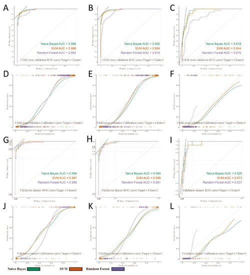 Comparison of machine learning models in the validation set. (A,D,G,J), (B,E,H,K) and (C,F,I,L) are the ROC curves and calibration curves of Cluster1, Cluster2 and Cluster3 classifiers, respectively. We compared three machine learning algorithms and evaluated the classification performance of the models using several metrics and ultimately found that SVM performed the best (Supplementary File S2).