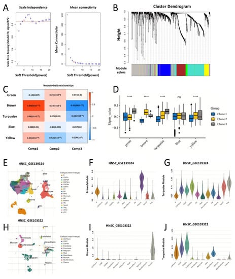Identification of immune gene co-expression module of HNSC. (A) Scale-free fit index and mean connectivity for the soft-thresholding powers. (B) Dendrogram of immune genes clustered based on a dissimilarity measure (1-TOM). (C) Module–trait relationship matrix (Pearson correlation). (D) Differential distribution of module eigenvectors in each cluster (t-Test). **** p < 0.0001, ns: not significant. (E–G) Cellular localization of single-cell transcriptomes of co-expression modules. In the HNSC GSE139324 dataset, the hub genes (MM > 0.9) of the brown module are mainly enriched in plasma cells. The hub genes (MM > 0.9) of the turquoise module are mainly enriched in CD8+ T cells, especially the expanded CD8+ T. (H–J) In the HNSC GSE103322 dataset, the hub gene of the brown module is also enriched in the plasma cell. The co-expression network of the turquoise modules mainly occurs in T lymphocyte subsets. In the HNSC GSE103322 dataset, the hub gene of the turquoise module is mainly enriched in T lymphocytes. These results indicate that there is extensive activation of T lymphocytes in the tumor microenvironment.