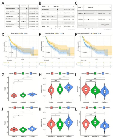Identification of immune hub genes of HNSC. (A) Uni-cox survival analysis list of immune-related features that significantly affect the prognosis of HNSC patients. (B) Forest plots of uni-cox survival analysis of Pseudotime and 5 module eigenvectors of HNSC. (C) Immune infiltration of class-switched memory B cells can significantly improve the prognostic survival of HNSC patients in Cluster1 and Cluser2 immune subtypes, but it is uncertain in Cluster3 immune subtypes. (D) Kaplan–Meier curves of differential brown module eigenvalues and prognoses in patients with HNSC; patients with high brown module eigenvalues had better overall survival (OS). (E) Kaplan–Meier curves of differential turquoise module eigenvalues and prognoses in patients with HNSC; patients with high turquoise module eigenvalues had better overall survival (OS). (F) Kaplan–Meier curves of differential class-switched memory B cell scores (xCell) and prognoses in patients with HNSC (logrank test). (G–I) Comparison of TIDE, dysfunction and exclusion scores for different immune subtypes. Comparison of scores of Cluster1, Cluster2 and Cluster3 immune subtypes. (J–L) Comparison of scores of Cluster1A, Cluster1B and Cluster2 immune subtypes. * p < 0.05, *** p < 0.001, **** p < 0.0001 and ns: not significant.