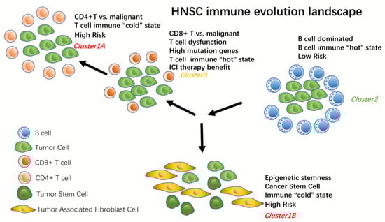 Molecular evolutionary landscape of the immune landscape of HNSC. Cluster2 is in the B cell dominant state, Cluster1A is in the CD4+ T dominant state, Cluster1B is in the fully deactivated T cell state (epigenetic stemness activation state) and Cluster3 is in the CD8+ T dominant state. However, Cluster2 has a higher survival rate, mainly because B lymphocytes are the dominant factor for prognostic survival in HNSC.
