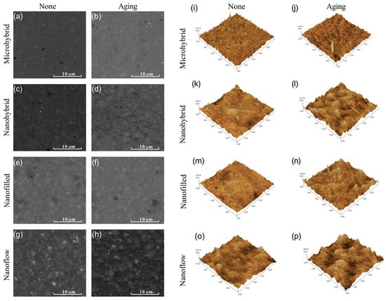 The representative SEM images of composites before and after aging are shown in Figure 1a–h. The surface morphology of the same sample before and after aging is shown by AFM images in Figure 1i–p and by the statistical analysis of roughness average (Ra) in Figure 2a. Among untreated samples (Figure 1i,k,m,o and Figure 2a), the nanoflow composite showed a greater Ra than other groups (p < 0.05). The aging treatment with salivary microbes for 30 days seemed to increase the surfaces’ roughness, but with no statistical significance (p > 0.05). Comparing the four composites after aging (Figure 1j,l,n,p and Figure 2a), micro-hybrid composites exhibited the smoothest surfaces, followed by nano-hybrid and nano-filled ones, while the nanoflow composite showed the roughest.