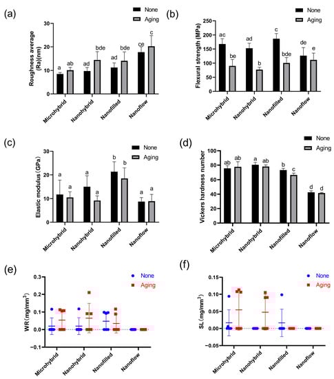 Statistical analysis of roughness average (a), flexural strength (b), elastic modulus (c), Vickers hardness (d), water resorption (e) and solubility (f) of composites before and after 30-day bio-aging. Each value is mean ± SD; n = 6. Values with dissimilar letters are significantly different from each other (p < 0.05).
