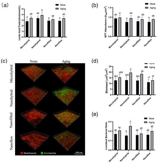 (a) Lactic acid productions of 48 h saliva biofilms on composites before and after aging. (b) The MTT metabolic activity of 48 h saliva biofilms on composites before and after aging. (c) Live/dead bacterial staining of the 48 h saliva biofilms on composites before and after 30-day bio-aging. Statistical analysis of biomass (d) and live/dead bacterial ratio (e) of the 48 h saliva biofilms on composites before and after 30-day bio-aging. Each value is mean ± SD, n = 6. Values with dissimilar letters are significantly different from each other (p < 0.05).