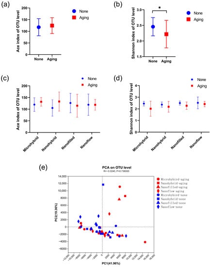 The alpha and beta diversity. (a–d) Alpha diversities based on OTUs: (a) shows the total richness of four composites as a whole group before and after aging by Ace and the total diversity by (b) Shannon indices, while (c,d) show the richness and diversity by the Ace and Shannon indices of different composite groups. The Kruskal–Wallis test was used to compare the significant difference. (e) Beta diversity by PCA of all groups based on the distance matrices. PC1 and PC2 explained 61.32% of the total PCA variability. A p-value of < 0.05 was considered statistically significant (* p < 0.05).
