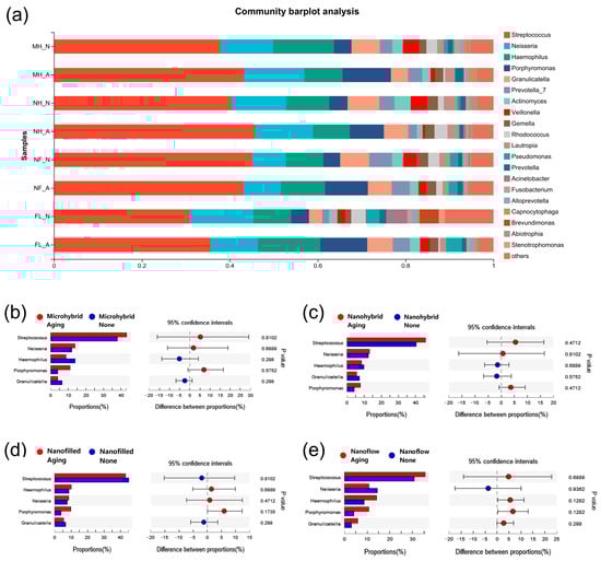 The proportion of community abundance at genus level of the 24-h in situ biofilms. (a) The comparisons of biofilms on composites before and after aging at genus level. (b–e) The other data subjected to Wilcoxon rank-sum test on genus level. A p-value of < 0.05 was considered statistically significant.