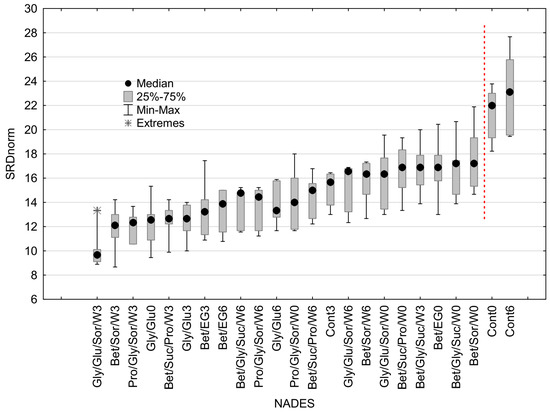 | Glycerol/Proline/Sorbitol/Water | 1:1:1:13 | Pro/Gly/Sorb/W | 190.55 | 23.70 ± 1.44 |