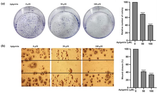 Cell proliferation and cell migration assay results. (a) Colony formation assay was performed on HepG2 cells at indicated concentrations of apigetrin (0, 50, and 100 µM) for 10 days and colonies were stained by Giemsa solution. (b) A wound healing assay was performed at stated concentrations (0, 50, and 100 µM) of apigetrin for 48 h. The data are presented as the mean ± standard error of mean (SEM). *** p < 0.001.